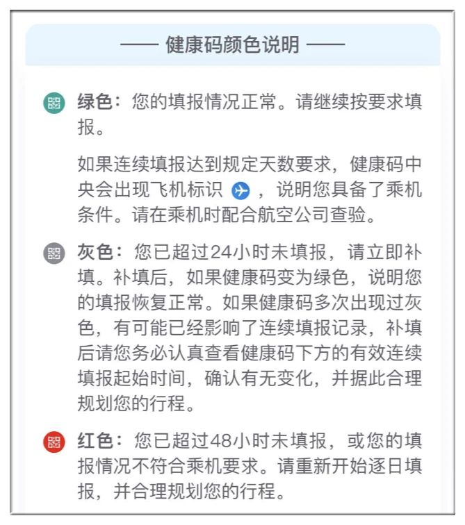 綠碼:表示你的填報(bào)情況正常,請繼續(xù)在規(guī)定時(shí)間內(nèi)填報(bào),不得登機(jī)。等到綠碼連續(xù)填報(bào)達(dá)到了規(guī)定的天數(shù)要求,健康碼中央會(huì)出現(xiàn)飛機(jī)標(biāo)識(shí)??,說明您具備了乘機(jī)條件。請?jiān)诔藱C(jī)時(shí)配合航空公司查驗(yàn)。