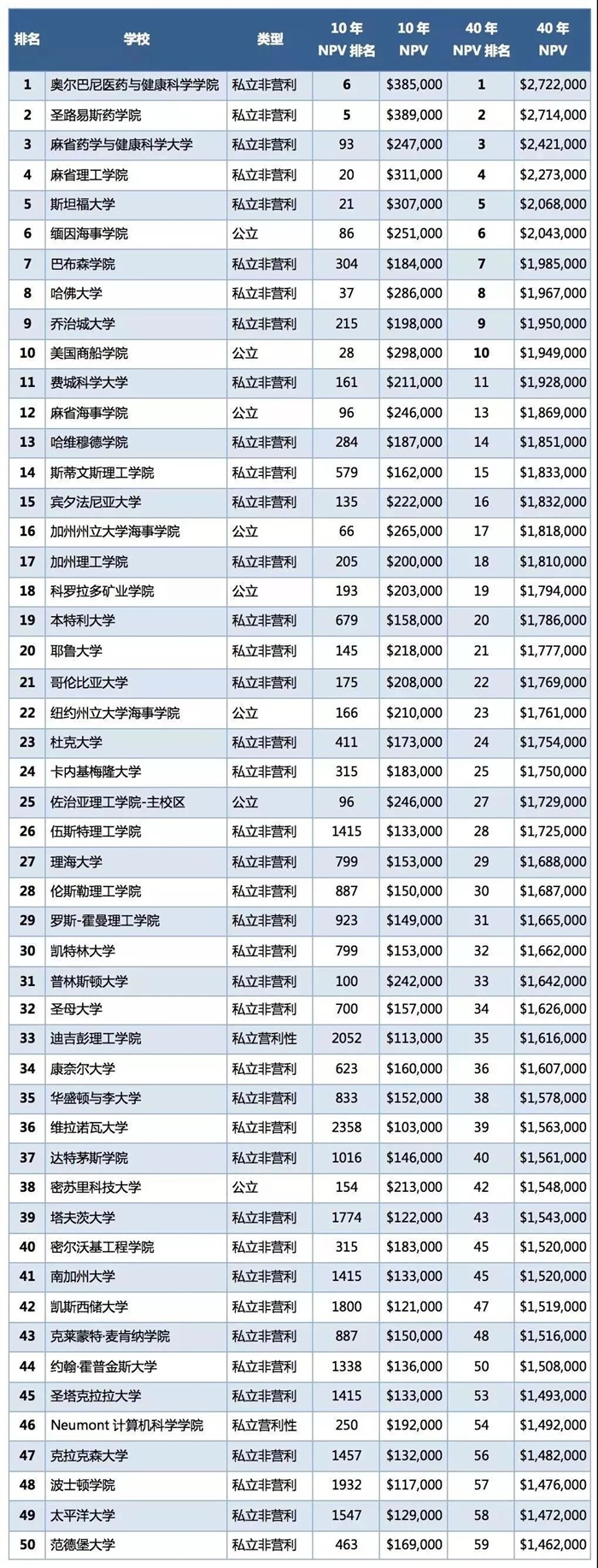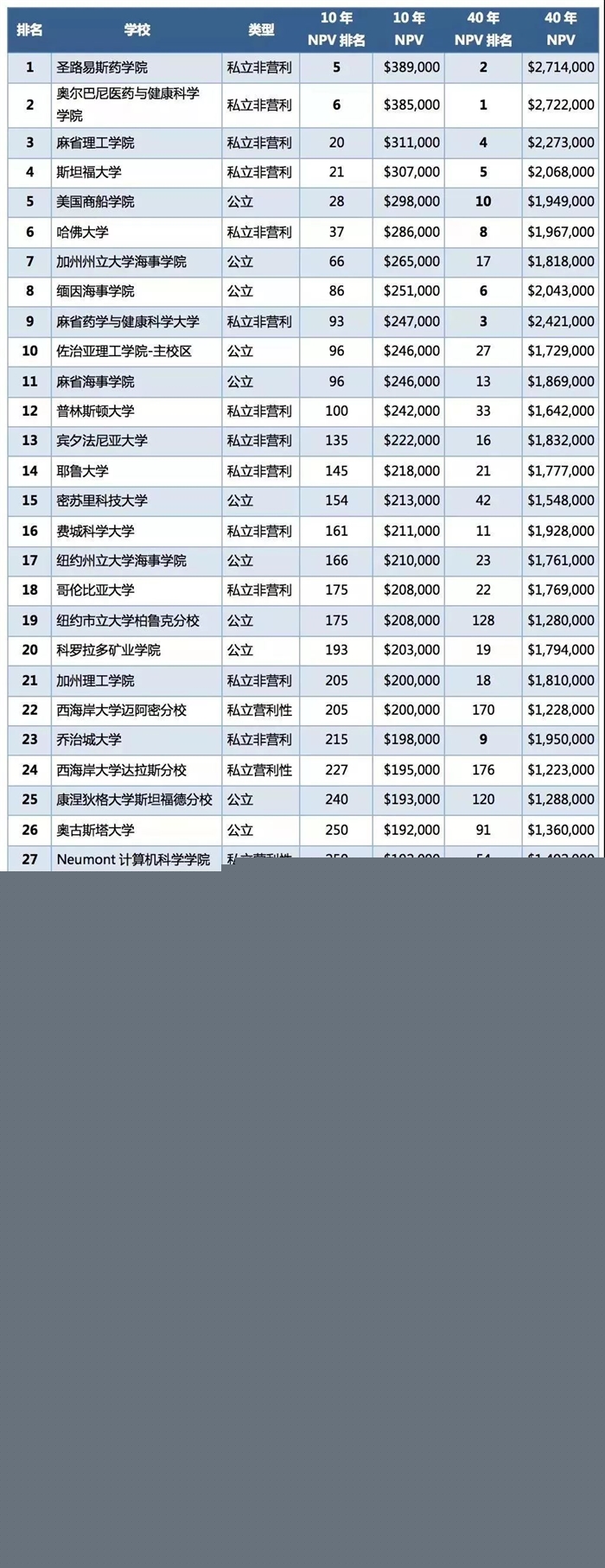 短期和長期NPV差距最大的是斯蒂文斯理工學(xué)院,它的10年NPV排名為579名,遠遠比不上那些社區(qū)大學(xué)短期項目,而40年NPV排名則一下子躍升至第15名,成為長期投資回報率最高的學(xué)校之一。