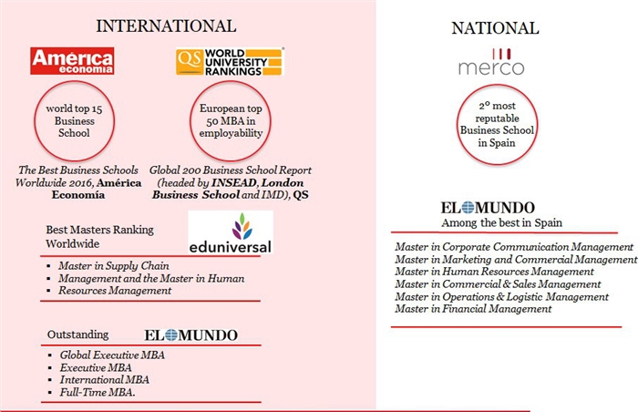 * 連續(xù)四年位列西班牙 Merco 商學(xué)院排行第二。“Merco 排名”每年分析西班牙 100 家資歷最高的公司的社會(huì)名望,從 2007 年開始,EAE 就躋身為西班牙五強(qiáng)商學(xué)院之一。每年有 700 多個(gè)公司競爭排名資格,只有 100 個(gè)公司能獲得提名,而 EAE 已在此穩(wěn)居 10 年之久。
